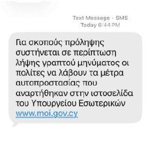 Министерство внутренних дел Кипра опубликовало пример тестового SMS-оповещения, которое сегодня рассылалось жителям острова в рамках проверки новой системы экстренного информирования населения.