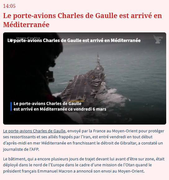 🇫🇷 Французский авианосец «Шарль де Голль» прибыл в Средиземное море на фоне конфликта на Ближнем Востоке.