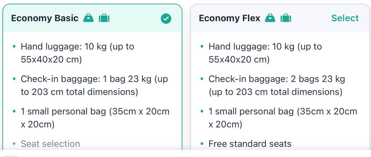 В тариф basic уже включен багаж до 23 кг., а в тариф flex - 2 чемодана по 23 кг.