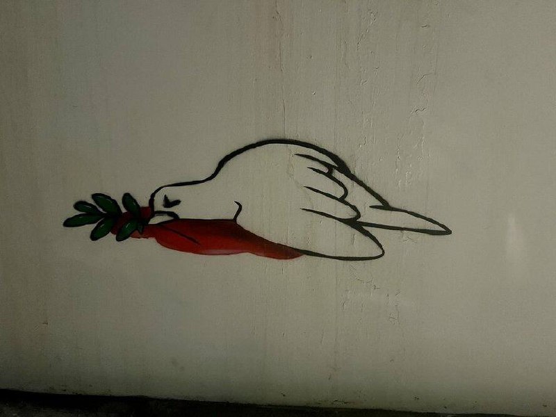 Мертвый, со сложенными крыльями и красной кровью повсюду, но при этом старательно держащий во рту оливковую ветвь. Какой-то молодой человек убил его, уверенный в своем превосходстве.