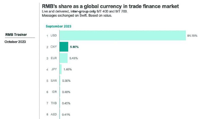 Доля китайской валюты в международных платежах выросла с 4,82% в августе 2023 года до 5,8% в сентябре, что является максимальным показателем за последние 5 лет, в течение которых ведется статистика.
