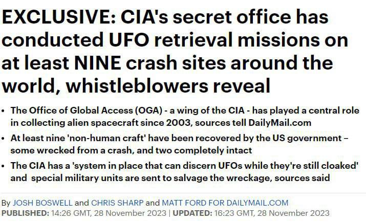 Инсайдер также утверждает, что у ЦРУ есть как минимум девять аппаратов внеземного происхождения, два из которых не повреждены.
