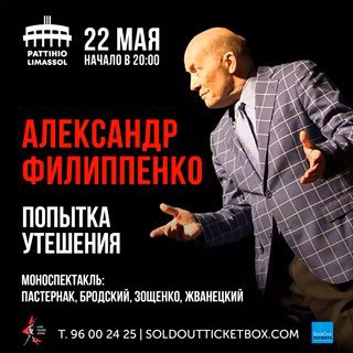 Лимассольский вечер с блестящим актером и любимцем публики Александром Филиппенко — это исцеление души зрителя. Александр Филиппенко читает с фирменными интонациями, глубокими паузами, узнаваемой авторской мимикой и пластикой.