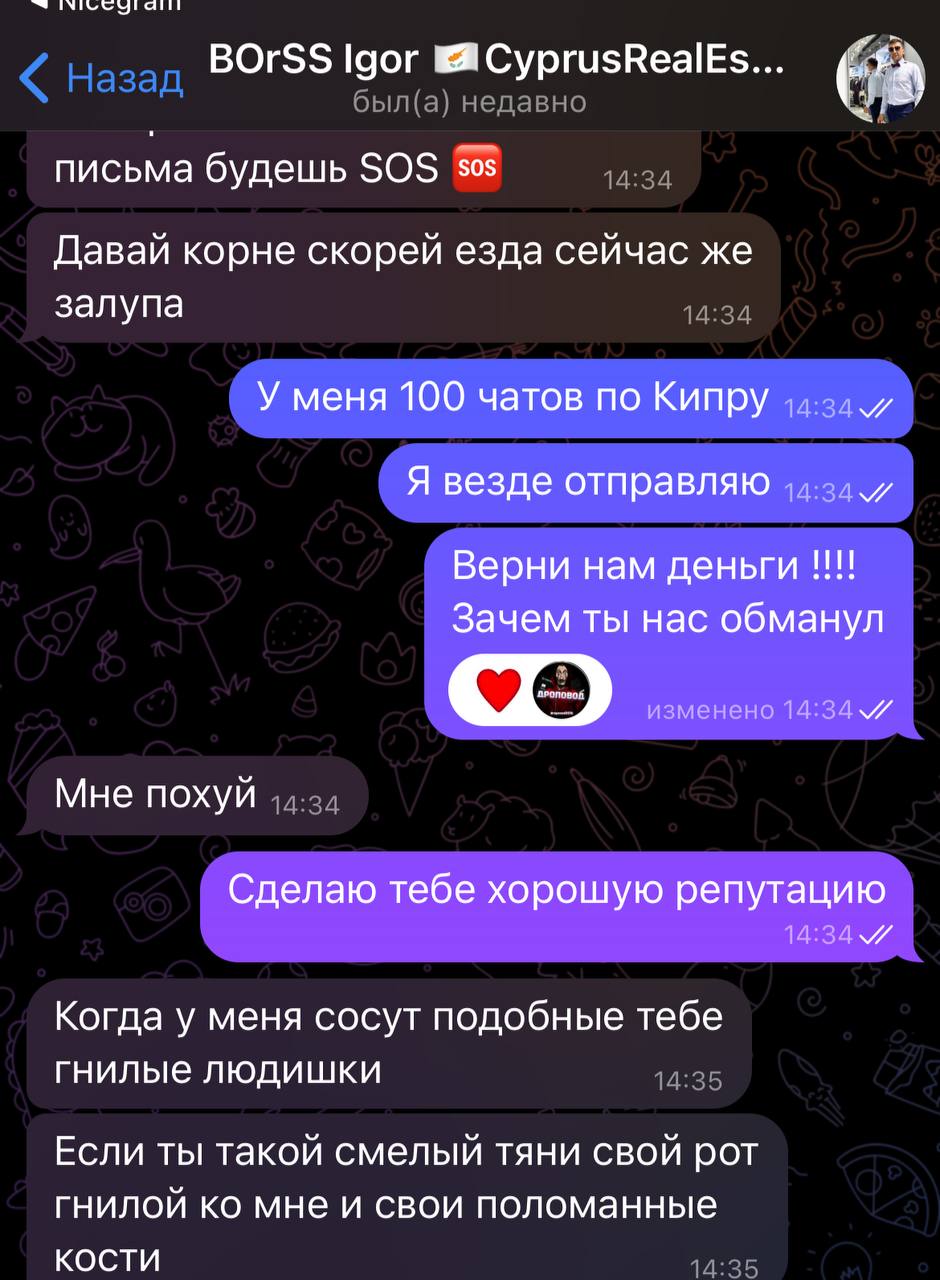 меня тоже прокидал и потерялся. Как найти данного персонажа? Кипр довольно не большой , надеюсь найдутся порядочные и дадут ему прикурить