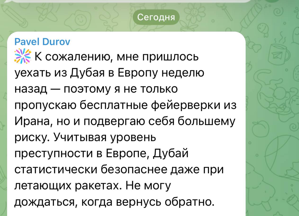 Мдээм Кстати Дуров про Дубай сказал забавно, говорит даже с летающими ракетами над небом там безопасней чем в Европе 😬