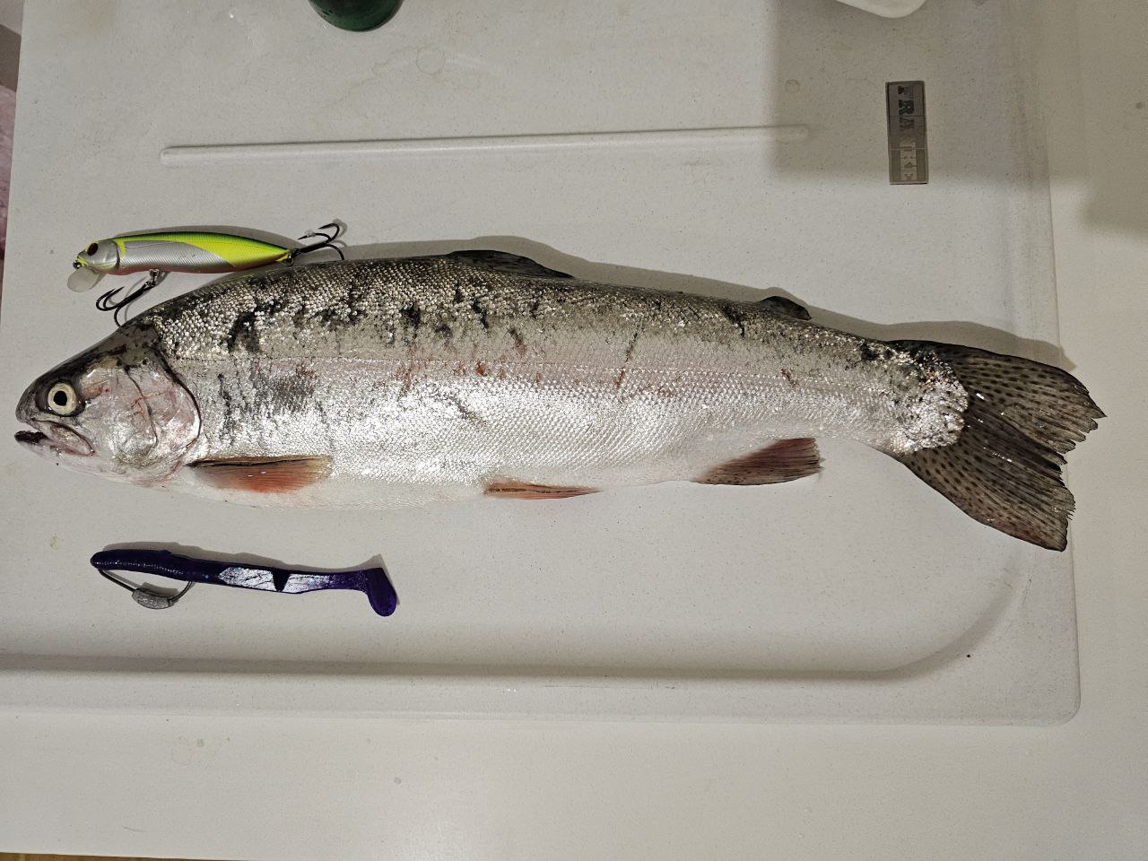 @Dmitry_BELARUSПоехал я на следующую дамбу на вечер, упирался в басса, и вот на 6" резину на пелагический джиг кусает кто-то, подвожу и на глазах форелина хорошая пытается резину эту отъесть! Поставил воблер 110мм и через пару проводок клюнула! Закилошная. Закровила, поэтому фото дома.