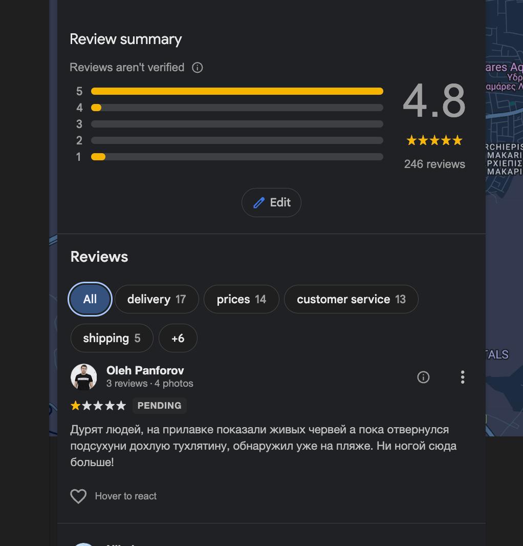 @5154407677Вчера в Ларнаке в этом магазине, здоровый детина с бородой продал мне тухлого морского червя. Открывал показывал, были нормальные и без запаха. Обнаружил только сегодня уже на берегу, ночь держал в холодильнике - подозреваю что подменил пока я ещё что-то выбирал. Проверяйте, Коллеги!