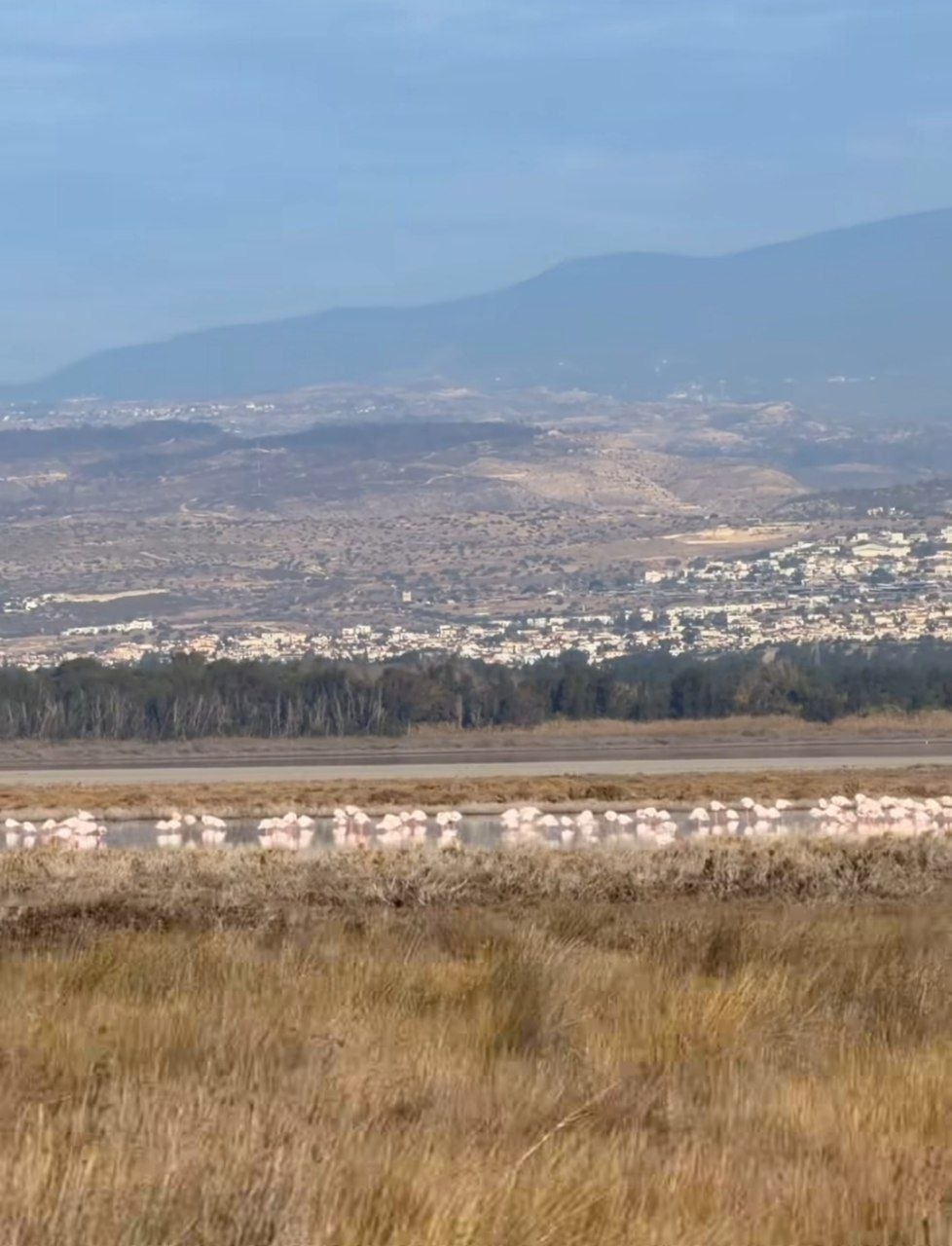 В лимассоле на солёное озеро прилетели фламинго и довольно много их
