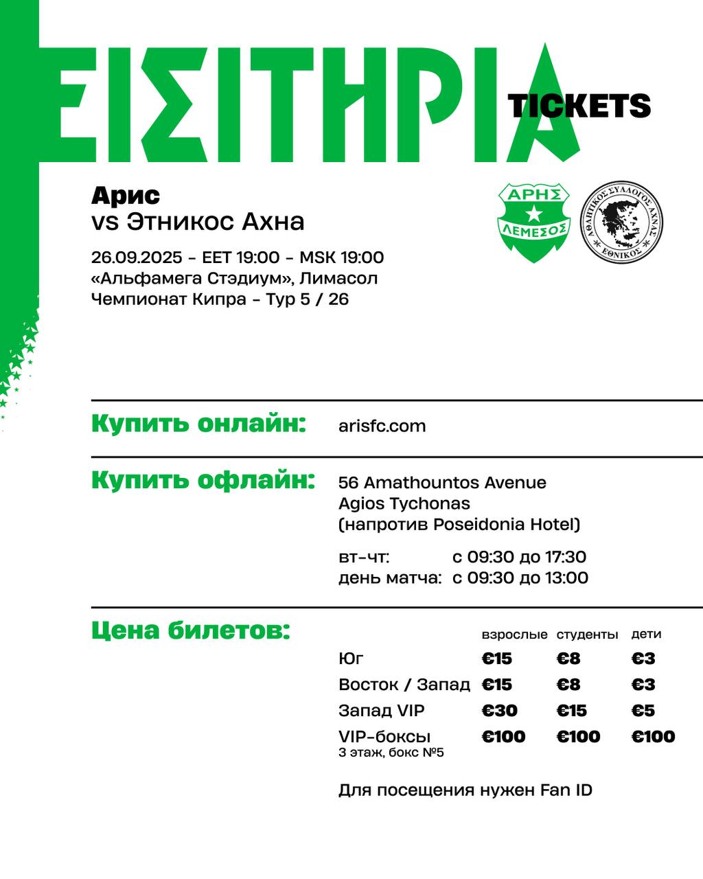 Билеты в продаже на сайте «Ариса» и в Aris FC Shop.