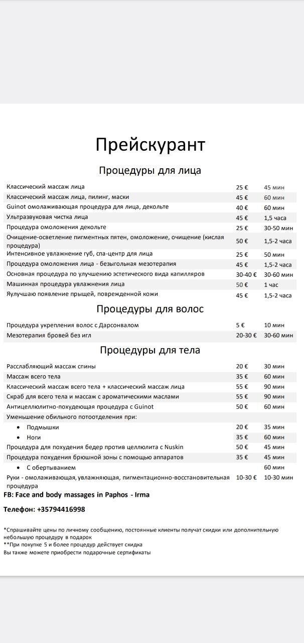 🔹массаж всего тела 1 час - 35 €. 🔹массаж спины 30 мин - 20 €. 🔹массаж лица 45 мин - 25 €.