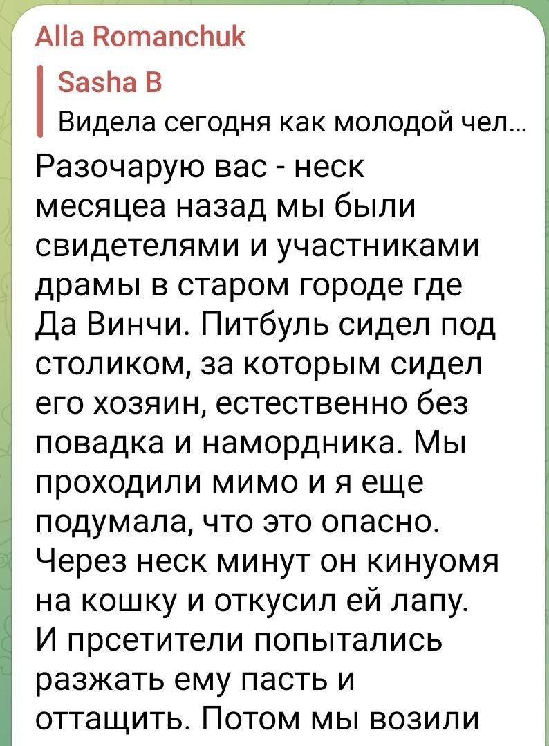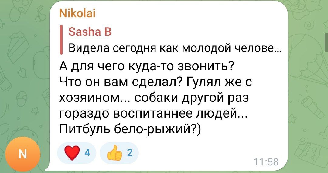 Вот мне хозяин собачки на 2 день, когда я закончила разгребать всё, что на меня упало, и я нашла этого хозяина. И подошла к нему. И сказала, что его собачка натворила дел. Он мне тоже сказал, что она очень воспитанная. Не агрессивная и безумно добрая. Вот почти вашими словами тут. После видео с камеры только уверенность прошла. А так да. Так же меня 2 минуты уверяли.... И я тут. Я за ней слежу. Она немного гуляет тут рядом....