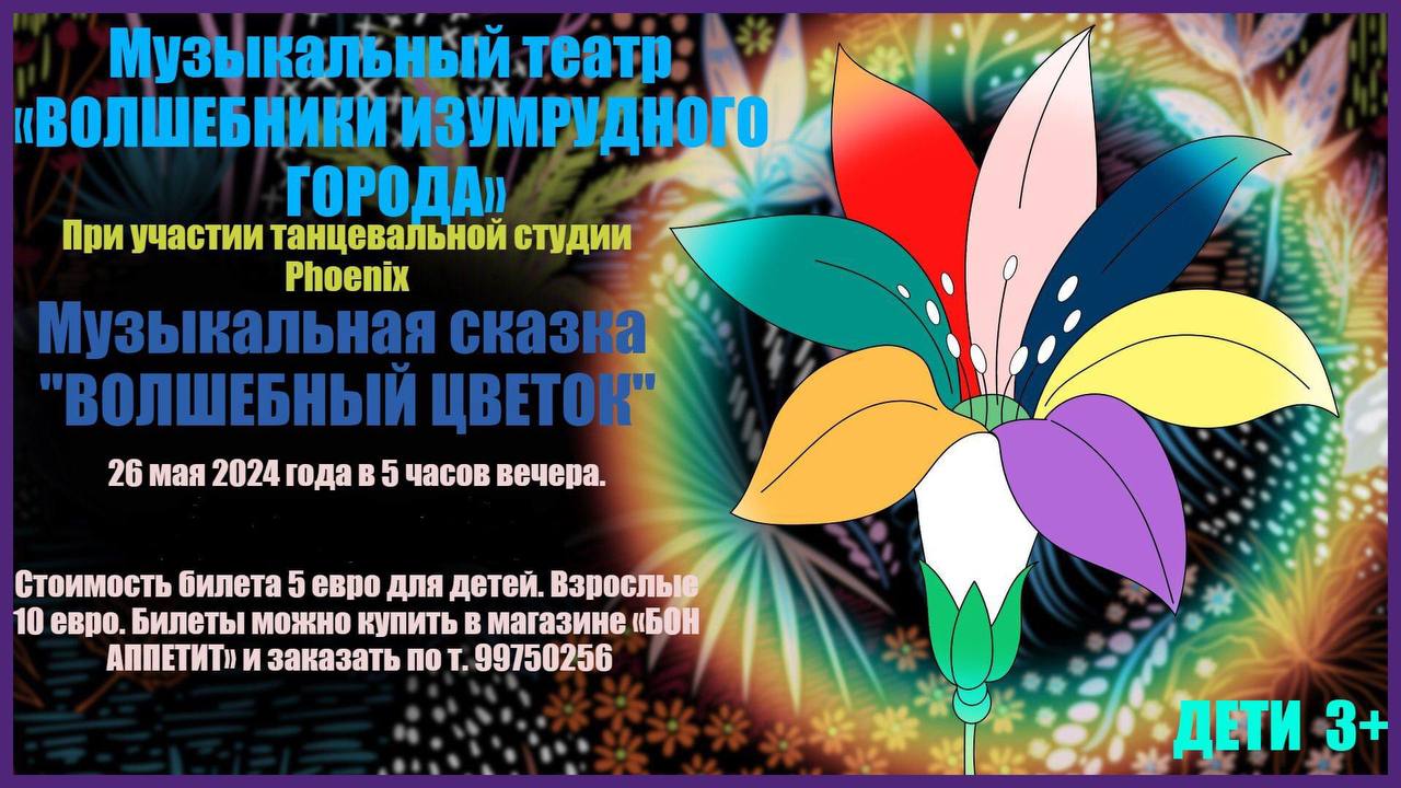 26 мая в 17:00 Музыкальная сказка «Волшебный цветок». Играют дети 4-8 лет и профессиональные актеры из музыкального театра "Волшебники Изумрудного города".