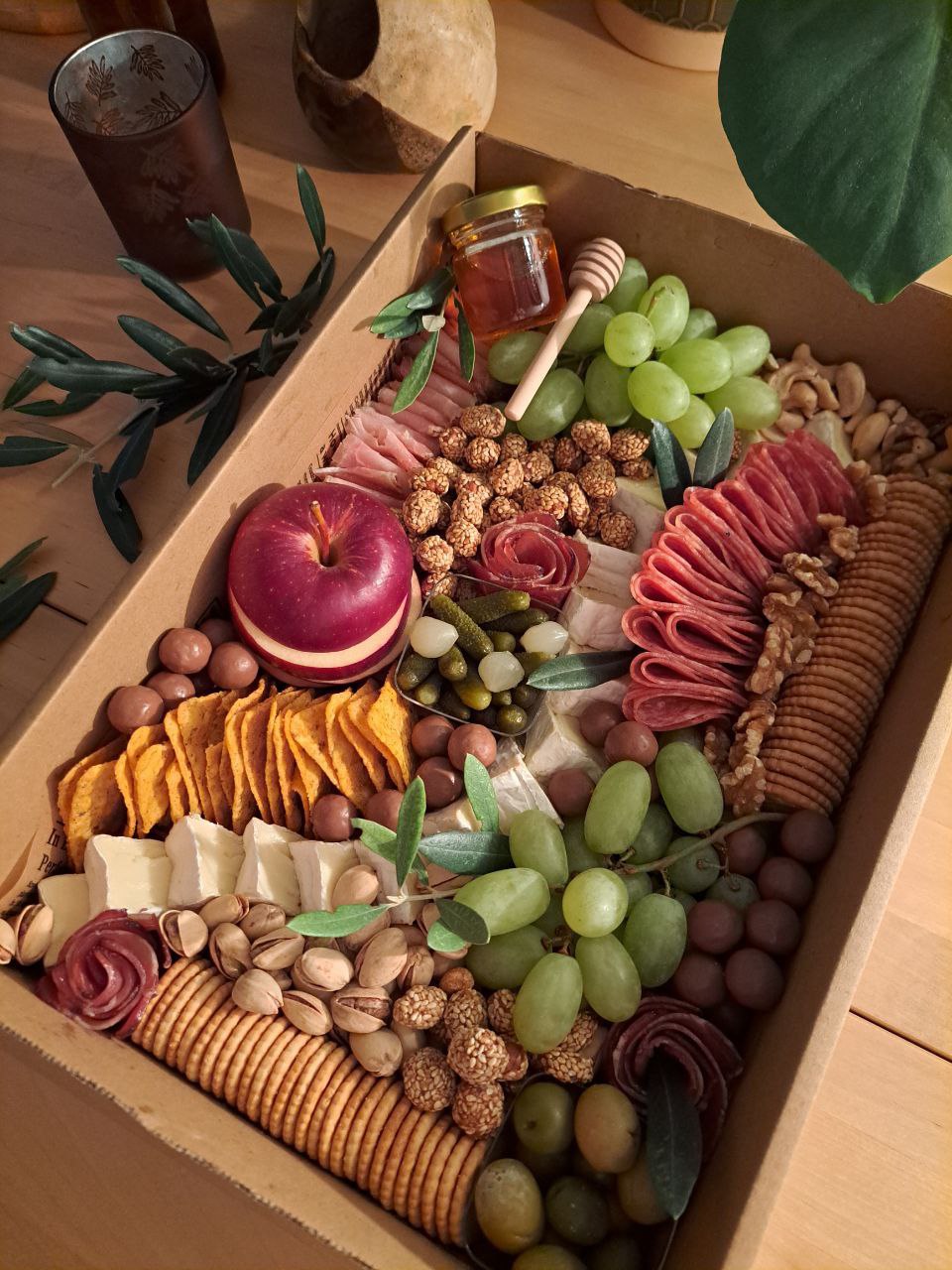 Каждая композиция собирается вручную: свежие фрукты, сыры, орехи, крекеры и закуски - всё продумано до мелочей, чтобы порадовать вас и ваших гостей.
