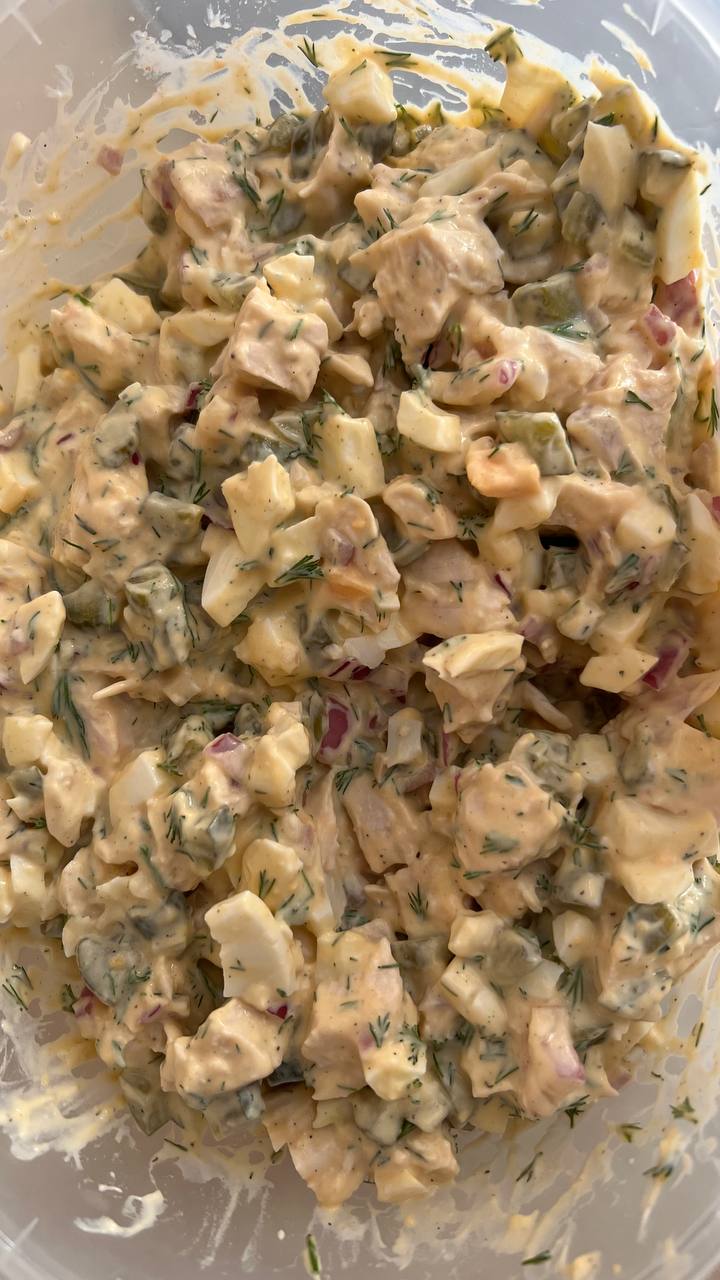 курочка варенная, лук, огурцы, зелень, типо столичного, но прикольно вышло 😋