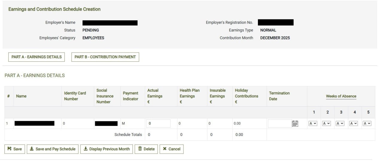 Пытаюсь подать Earnings and Contributions Schedule за декабрь 2025 (сотрудник на больничном весь месяц, зпл €0.00).