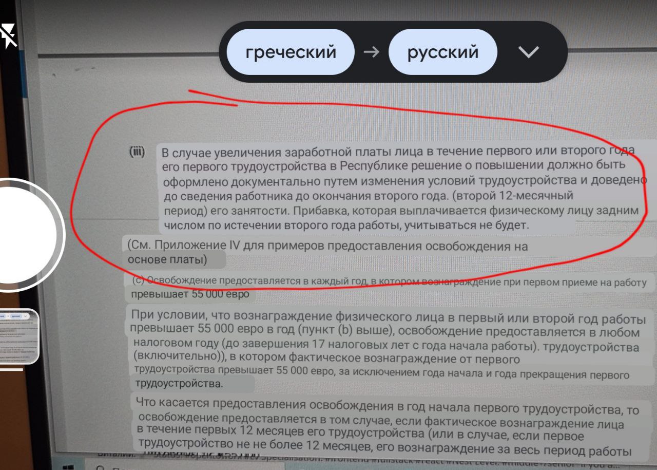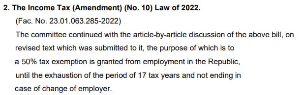 Я неоднозначно сформулировала вопрос, поправлю выше. Я имела ввиду, что кто соответствовал правилам поправки 23(А), вступившей в силу с 26.7.22, и до момента вступления в силу принятого сегодня изменения (сохраняли первое трудоустройство и не были резидентаии 10 последовательных лет) - к тем не применяется усиление ограничения до 15 лет, если они не меняли работодателя, я так поняла. То есть по сути будут 3 варианта применения скидки 50%: 1.Те, кто устроился до 1.1.22 с зп выше 100 т.р. до окончания 10летнего периода, 2. те, кто соответствовал правилам до вступления в силу сегодняшней поправки и продолжает работать на первого работодателя 3. Те, кто менял работодателя, но перед первым трудоустройством был нерезом на Кипре 10 лет вместо 15.