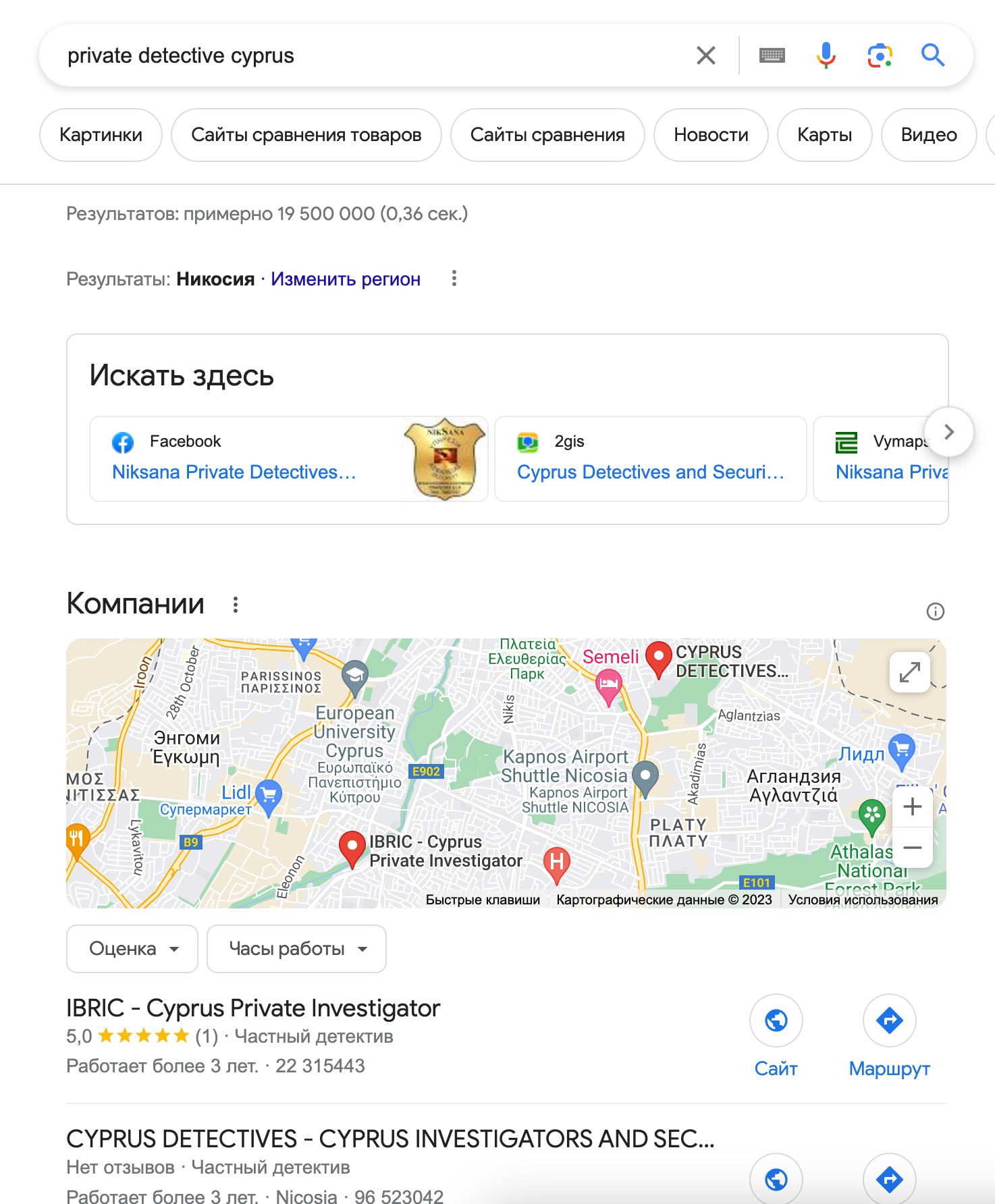 Добрый день! Прошу прощения, если не в правильное место пишу. Подскажите, пожалуйста, есть ли на Кипре частные детективы. Сильно ударили машину на парковке и скрылись. Полиция не помогает. Заранее спасибо.