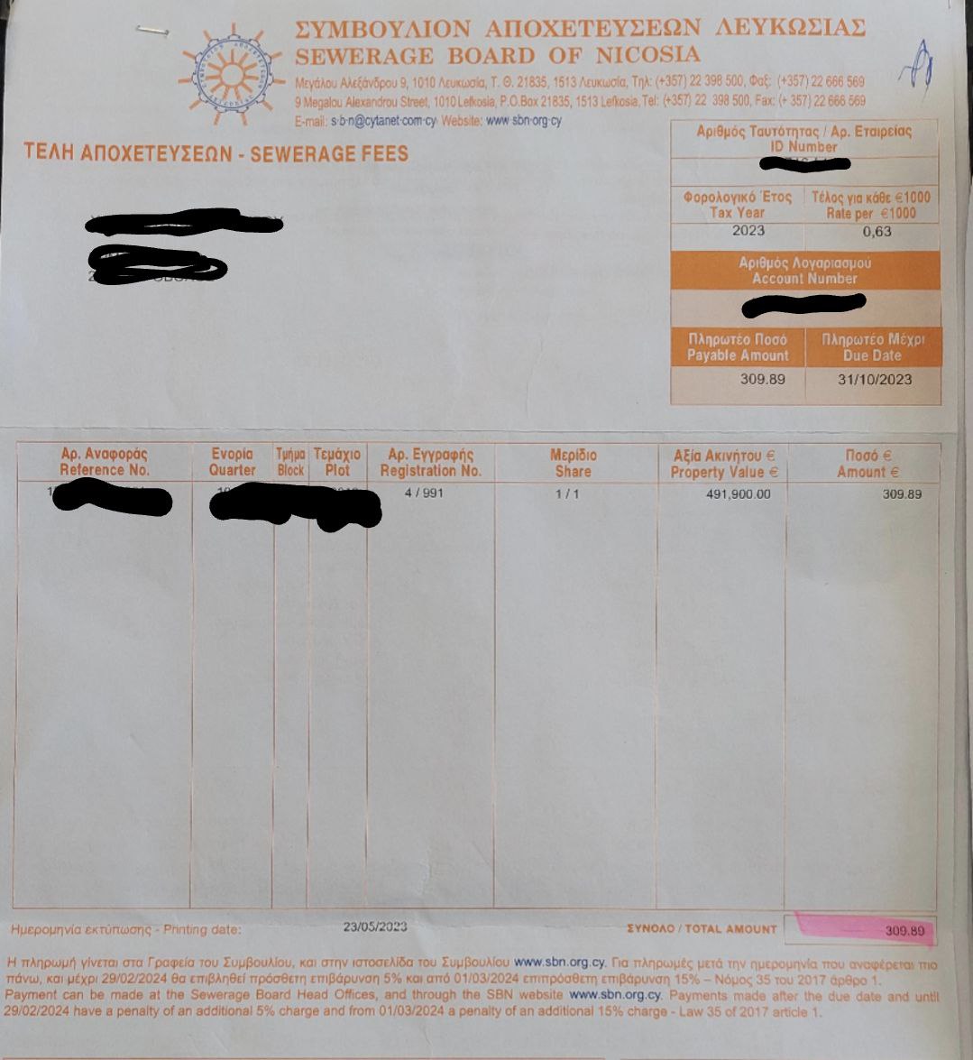 Народ, подскажите что за sewerage fees, который рассчитывается от стоимости недвижимости и оплачивается за год. Это налог такой на недвижимость? Лэндлорд просит оплатить, но как я понимаю обычный водоотвод входит в квитанцию от водоканала. Квитанция от sewerage board of Nicosia,в договоре на аренду при этом указано что оплачивается вода, электричество и мусор.