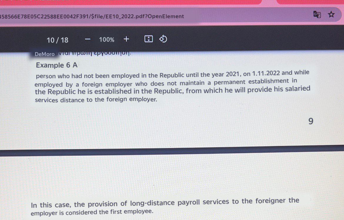 Добрый день! Подскажите плиз, распространяется ли 50% льгота с дохода если работаешь удаленно на компанию, которая зарегистрирована вне Кипра? В законе сказано - что льгота 50% предоставляется при первом трудоустройстве на Кипре, под первым трудоустройством понимается также работа на иностранного работодателя на территории Кипра.