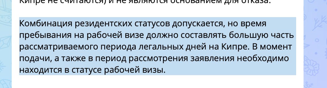 6) Для работников BSC - 4-3 года в окне 10 лет + 12 мес (90 дней выезда допускается) + сертификат А2/В1 соответственно + экзамен на знание истории и культуры Кипра. Здесь возможна комбинация других видов на жительство (например, Визитер/DN) за предыдущий период, но в момент подачи необходимо иметь рабочую визу BSC компании.