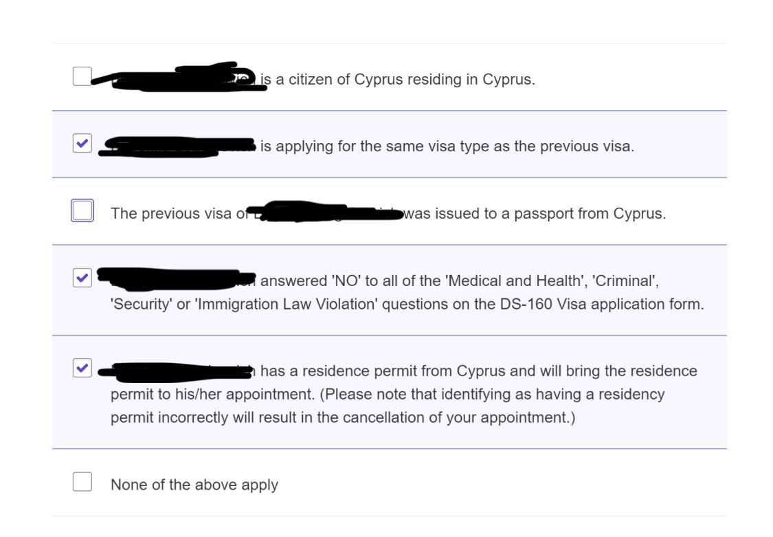 На Кипре повторная подача без интервью на визу США не работает. Паспорт РБ, нам только на год максимум дают визу. Получала как резидент Кипра в декабре 2022, потом подала здесь же в январе 2024 и там при заполнении всех пунктов при записи на интервью нет такой комбинации, что показывает отмену интервью. Там вопросы из серии «Вы получали предыдущую визу в паспорт Кипра?», «Ваша виза истекла менее 48 месяцев назад?», «Вы подаете на тот же тип визы?» и получается, что нет interview waver. Отмена собеседования выходит только тогда, если выбираешь паспорт Кипра, то есть только киприоты могут не проходить повторно собес. Причем я даже им в поддержку звонила и они сказали, мол, да, хоть вы и резидент, но приезжайте на собес.