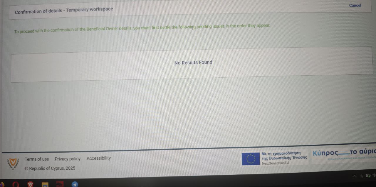 I would like to inform you that between the dates of 01/10/2025 - 31/12/2025, all companies should complete the Confirmation of Information in the Registry of Beneficial Owners. Please note that if by December 31, 2025, you have not proceeded with the update, the organization and each officer/partner will be subject to a financial penalty of one hundred euros (€100) on the first day and a further financial penalty of fifty euros (€50) for each day the violation continues, with a maximum total penalty of five thousand euros (€5,000).