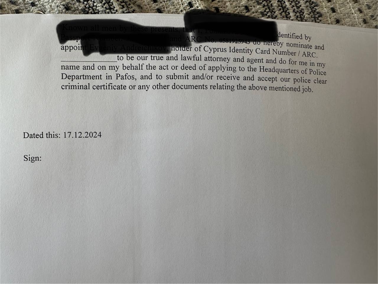 Подскажите, пожалуйста, доверенность на получение справки о несудимости на Кипре должна быть оригинал? Нужна подпись того, кто доверяет? Или можно скан? Или только доверенное лицо расписывается?