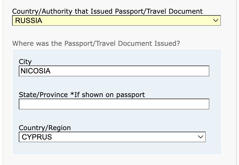 Подскажите по анкете DS-160 (Visa в США). Те, кто подавал и получал загранпаспорт в Никосии (на Кипре), что нужно указывать в графе: