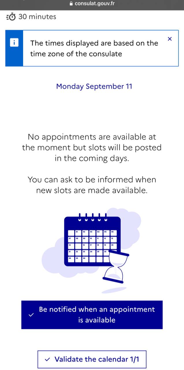 Кому-нибудь удавалось на Францию записаться? У меня уже который раз так, что в течение минуты после письма о наличии слотов захожу - и будто показывает доступную дату, но тут же пишет что слотов нет (как здесь например пишет 11 сентября наверху, а ниже - что слотов нет)