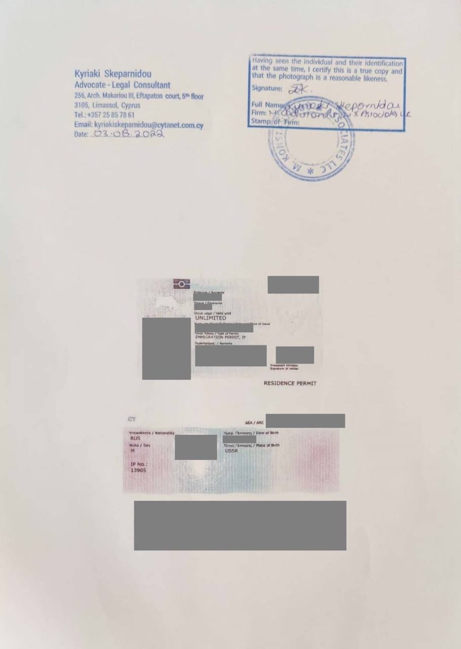 2) Заверенная нотариусом/адвокатом/юр. фирмой копия вида на жительство на Кипре -