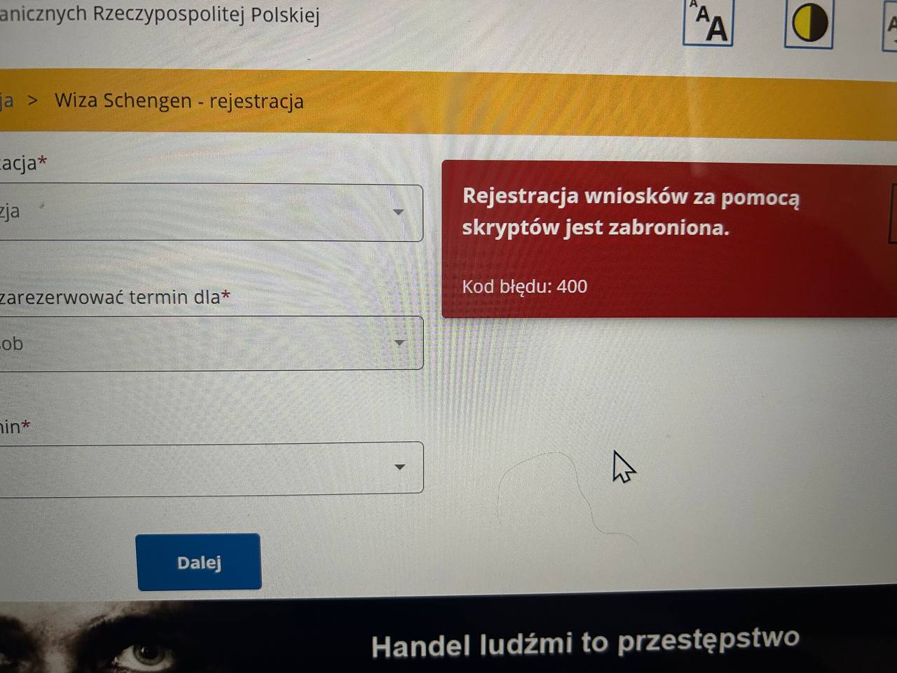 Добрый день! Может быть кто-то сталкивался с ошибкой на сайте Посольства Польши? При бронировании слота всплывает окно "Регистрация заявок с помощью скриптов запрещена." Компьютер перезагружала, заходила с разных браузеров, инкогнито, ошибка остается. Что можно сделать?