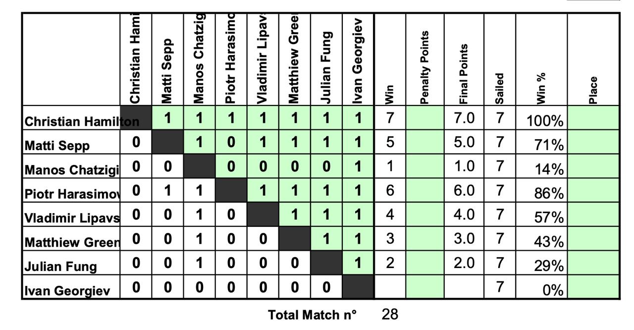 Two days of racing at the EMRT — the European Match Race Tour Finals — are now behind us. After today’s round-robin stage we can clearly see the frontrunners, and on Sunday we head into the semifinals and the finals. The battle will be incredibly tight, with margins expected to be razor-thin.