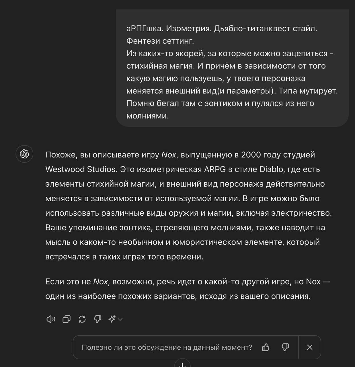 @mxeraПрикольно, попробовал в GPT4 и он с пятого запроса с уточнением нашел игру с детства про которую часто вспоминал. Но теперь новая проблема, как я не гуглил, скринов и упоминаний ее не нашел )) лол