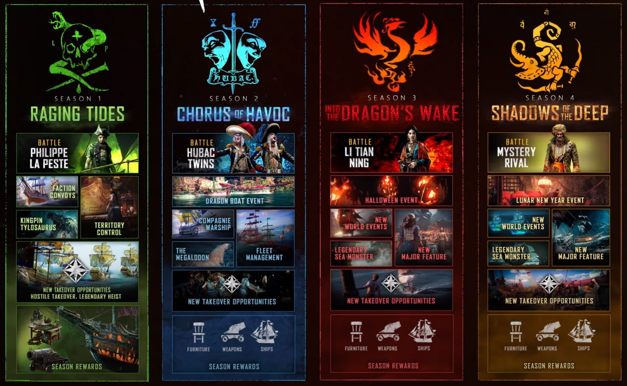 • каждый сезон будет крутиться вокруг определённого легендарного пирата, где будут уникальные мировые события и временные события.