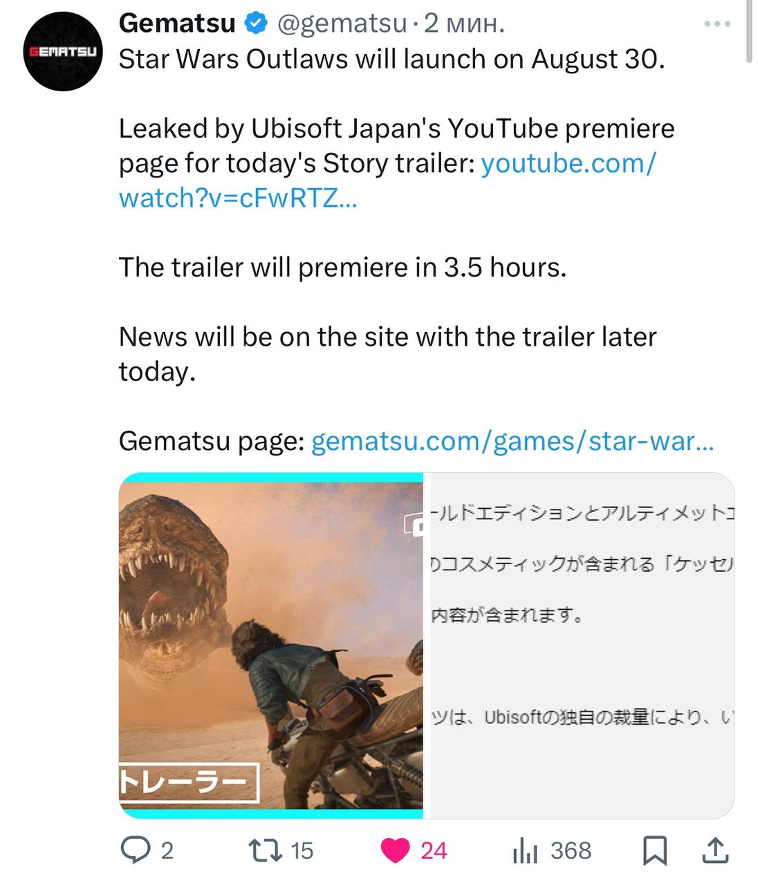❗️Star Wars Outlaws выйдет 30 августа — дата утекла на японском YouTube-канале Ubisoft