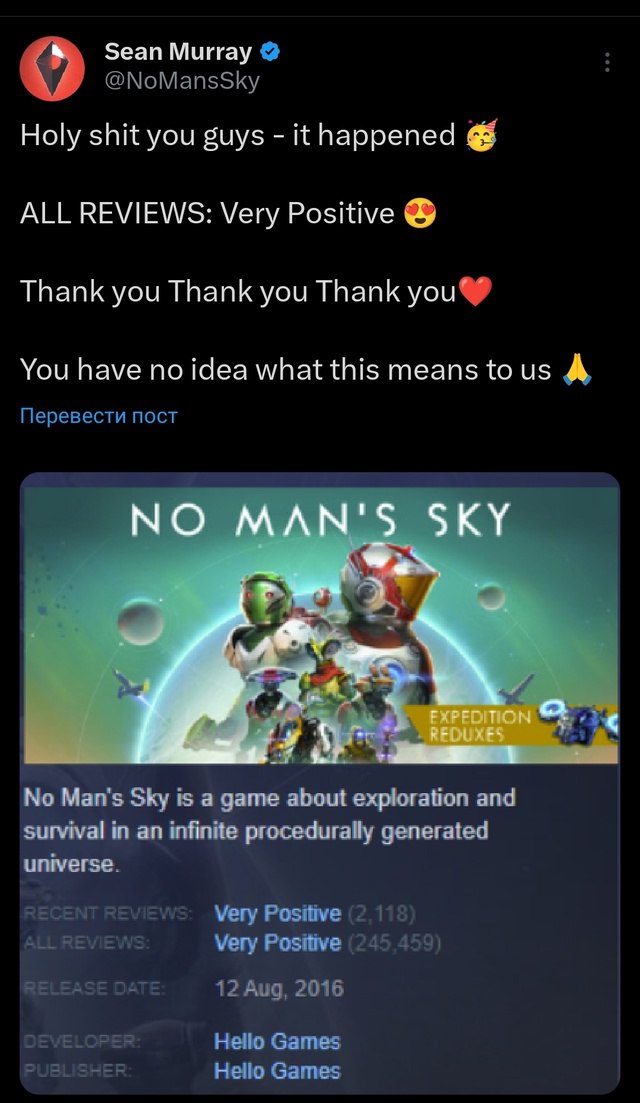 @despierosОтзывы No Man’s Sky в Steam стали «Очень положительными» спустя восемь лет после релиза.