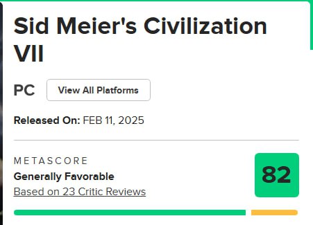 @liv_masterПервые оценки «Цивилизации 7» — 82 балла. Пока самая низкооценённая игра основной серии.