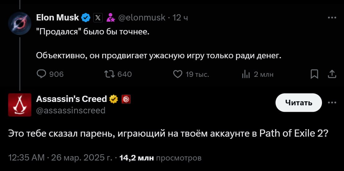 На это тут же среагировал аккаунт «Ассасинов», припомнив Маску обсёр с Path of Exile 2, когда того поймали за руку на прокачке персонажа левым типом.