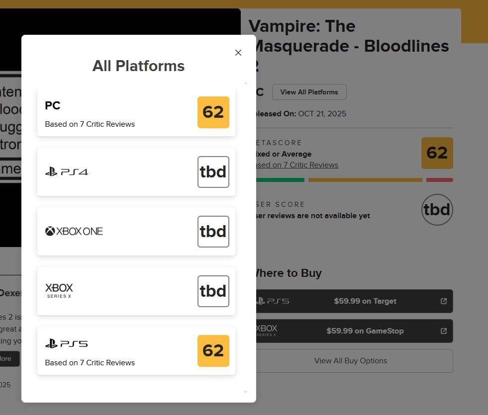 Первые оценки Vampire: The Masquerade - Bloodlines 2 — 62 балла.
