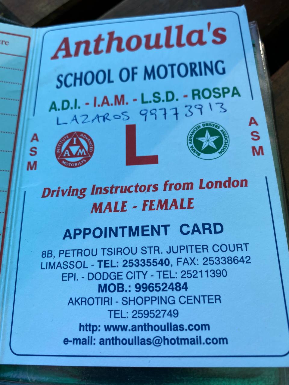 Или подьедь к роад департменту по дороге в Тродос, там инструктора на площадке, в субботу (если роад департмент не работает) или в воскресенье. Урок 1 час 30 евро, моты их 125 кубов