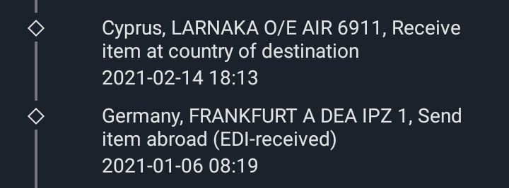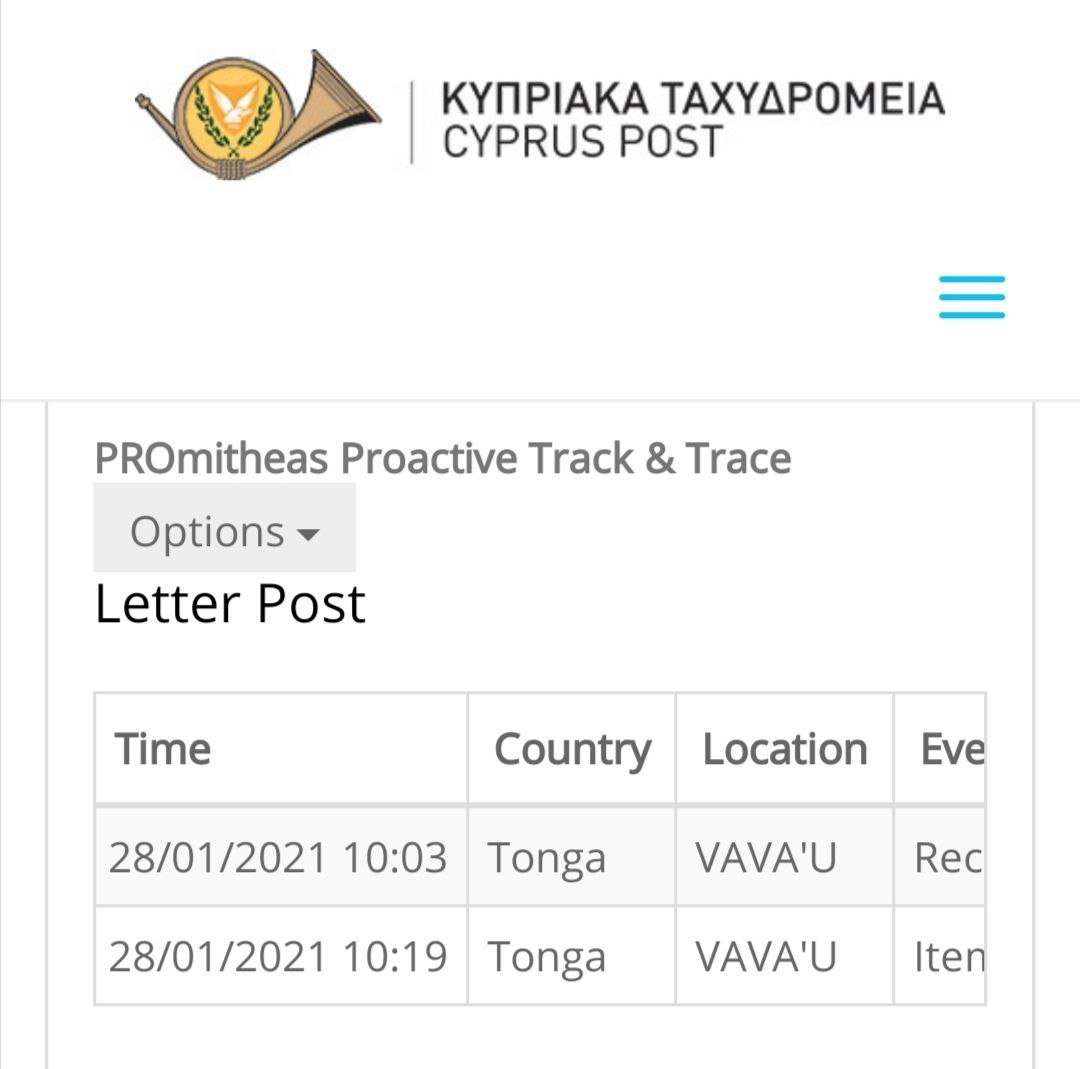 Забавная коллизия, в китайском магазине указан трек ***TO, в том же магазине он оттрекан уже до Лимассола, а во всех остальных трекингах - покинул островное королевство Тонга в Океании, даже с указанием острова