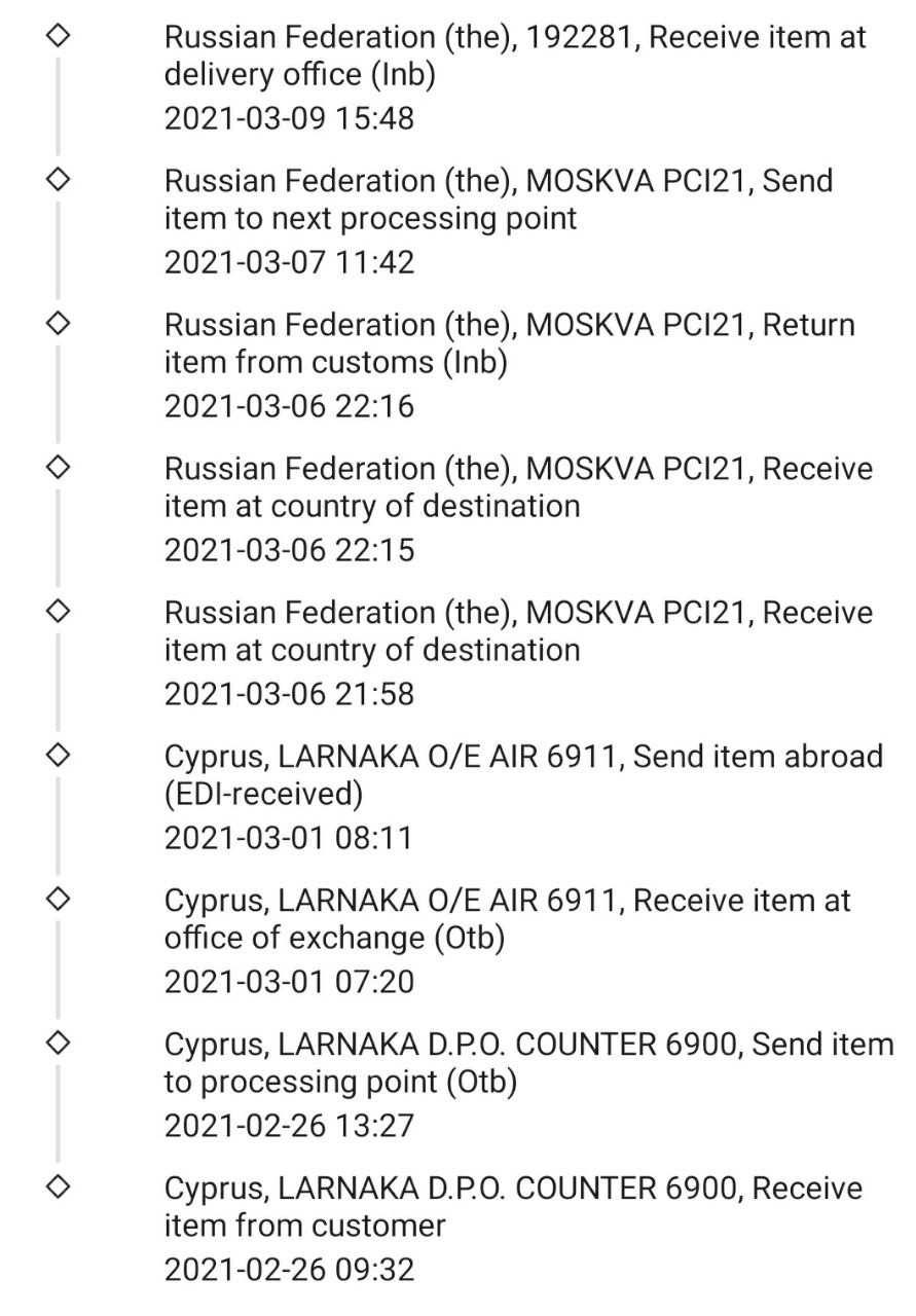 Добрый день! Появился «свет в конце тоннеля»: посылка , посланная из РФ в январе , добралась через Сербию на Кипр - сейчас в Ларнаке.