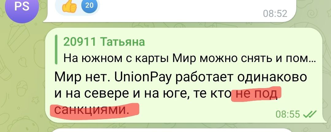 Мир нет. UnionPay работает одинаково и на севере и на юге, те кто не под санкциями.