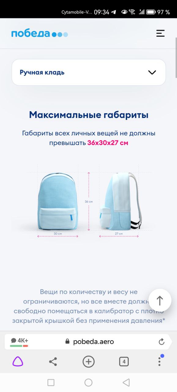 Победа не взвешивает ручную кладь, контроль только по размерам. Крышка калибратора должна закрыться со звоном. Надавливать нельзя