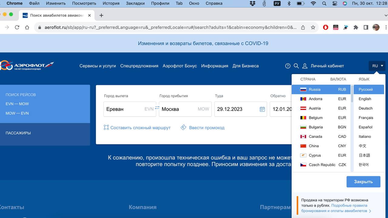 Я тоже все время здесь развлекаюсь с покупкой билетов Аэрофлота. Когда пытаешься выставить цену в рублях - выходит сообщение о тех проблеме. Делаю следующим образом, выставляю цену в евро, выбираю билет, и при прохождении следующих этапов ввода данных меняю валюту на рубли…