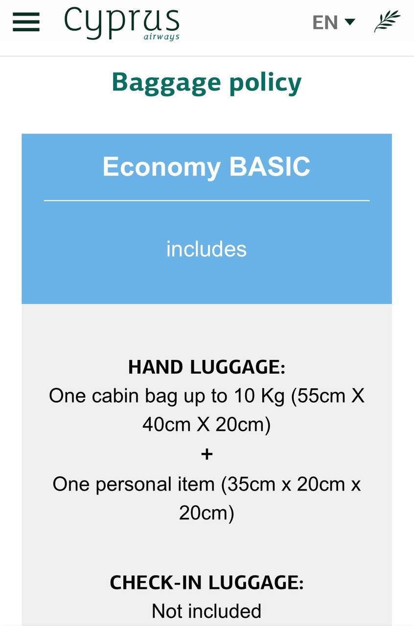 Елена права, кстати) в самом дешевом тарифе у Сайпрус всегда чемодан cabin size. Они еще милостиво его предлагают бесплатно сдать в багаж почти всегда