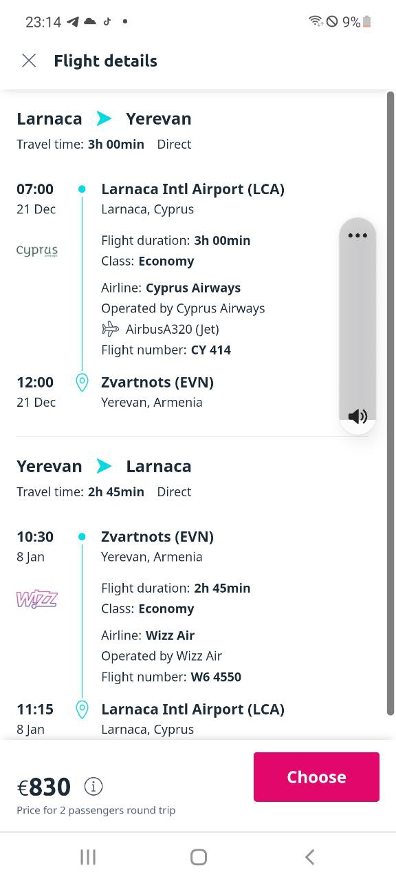 Спасибо!Я покупала через esky ,там идёт совместно cyprus и wizz,покупала быстро.Надо было сразу мне оплатить .Лечу на Новый год цены и так ах,ещё аэрофлот ,нас двое.А сейчас они уже дороже присылают за тоже самое.Вот и думаю.