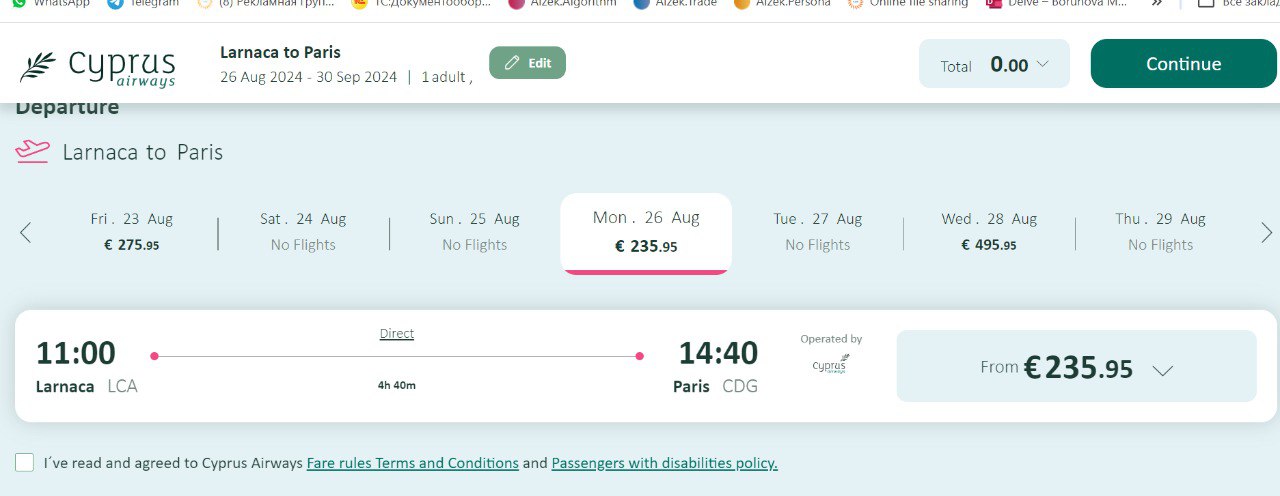 Добрый день! А кто-нибудь знает, что происходит с перелетами в Париж у Cyprus Airways? Поиском вообще нет никаких цен ни на полгода вперёд, ни раньше. В прошлом году все было. И расписание перелетов тоже непонятно, где искать