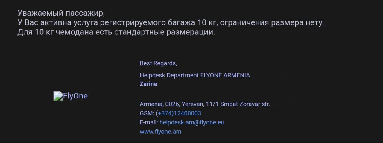 "У Вас активна услуга регистрируемого багажа 10 кг, ограничения размера нету.