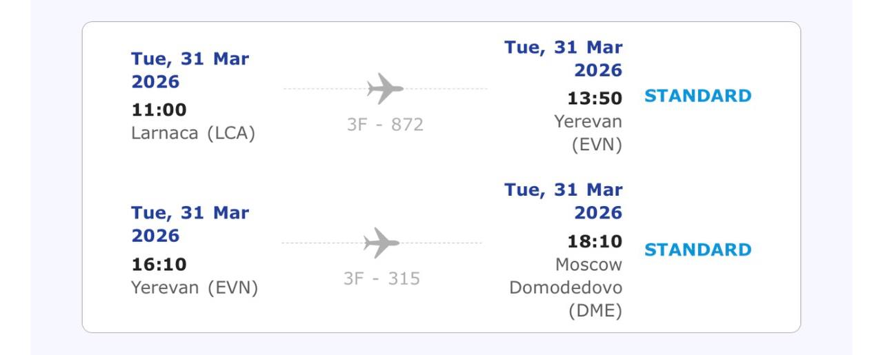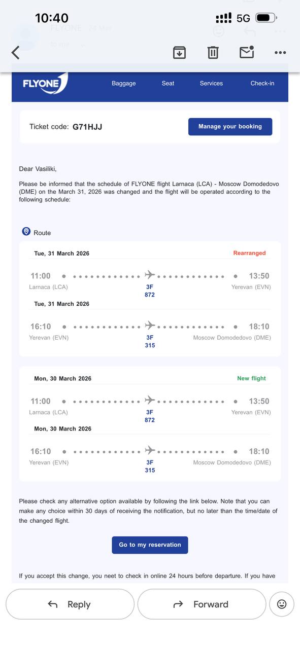 @1394343210Доброе утро! У кого нибудь были на сегодня билеты FLYONE в 11:00 Ларнака-Ереван-Москва? Приехали в аэропорт, рейса нет!! На почте писем никаких. В приложении пишут, что якобы вчера мы улетели, прохожий сказал, что на завтра перенесли (у него тоже были на сегодня билеты на этот рейс). Сотрудники НИЧЕГО не знают! А/к на звонки не отвечает